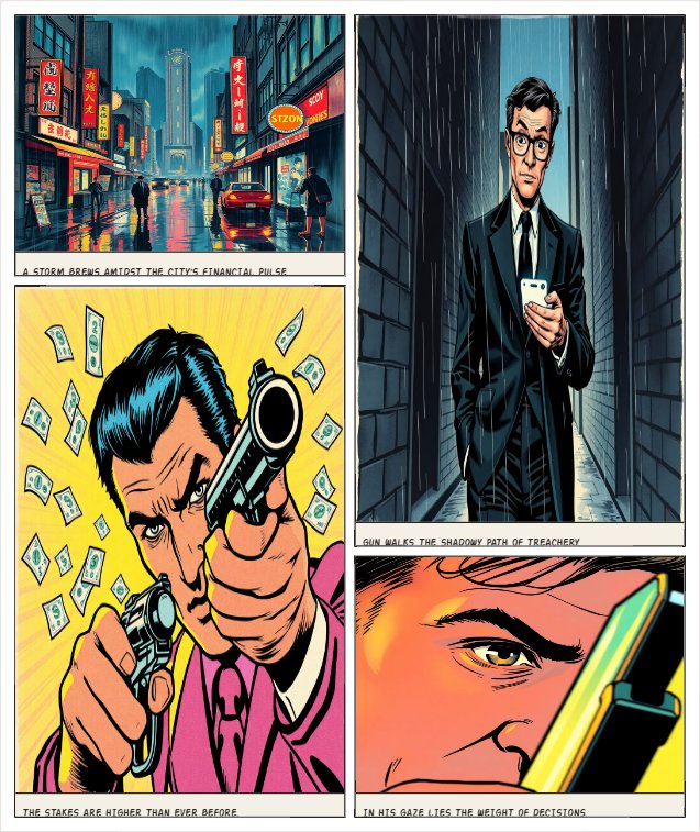 Panel 1: Wide establishing shot - Rainy night in Seoul's financial district, neon lights reflecting on wet streets, ominous atmosphere Panel 2: Gun Park (black eyes white pupil)walking alone in black suit and glasses through dark alley, rain dripping, cold expression, checking his phone with glowing screen Panel 3: Close-up of phone screen showing: "CODEX TRANSACTION CQOMPLETE - $2.4M USD → KRW INSTANT SETTLEMENT" with multiple currency symbols flowing Panel 4: Extreme close-up of Gun's eye