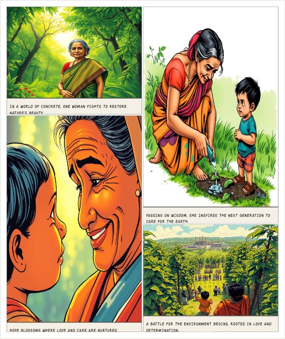 Based on the life and environmental contribution of Saalumarada Thimmakka create a comic in a cre...