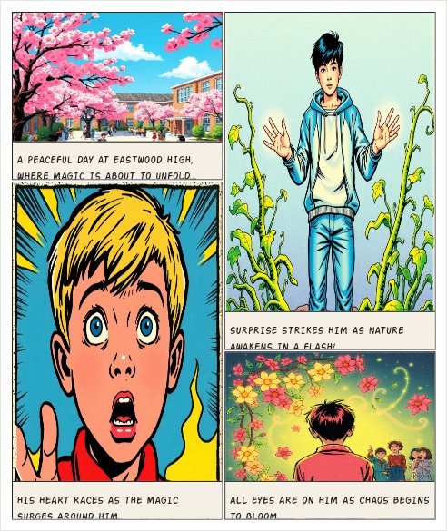 Panel Prompt Example: A teenage Korean boy stands in a school courtyard as green glowing vines burst from the ground around his feet, flowers blooming in seconds, his hands glowing with magical energy, shocked expression on his face, anime manhwa style, cinematic lighting, detailed comic panel.