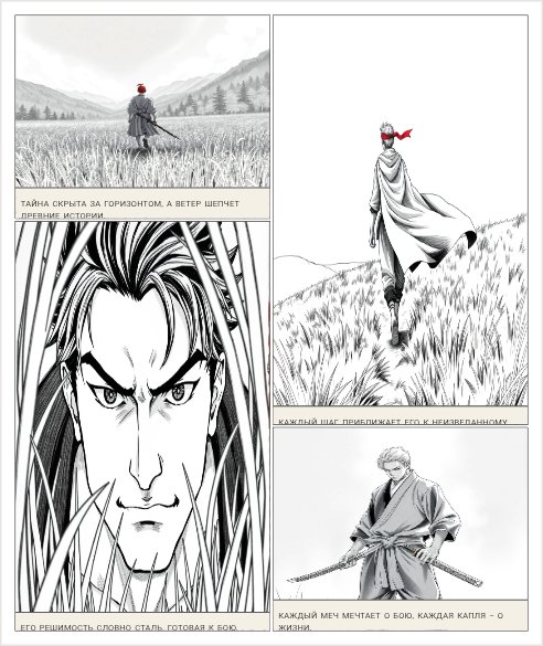 Человек с красной повязкой делает шаг вперёд по высокой траве, ветер сильнее колышет бинты и плащ. Катана на поясе слегка блестит на солнце. Вдали виднеются густые леса, а горные вершины скрыты лёгким туманом. Трава раскачивается под ногами, создавая ощущение движения и пространства. Атмосфера напряжённая, но тихая, как будто он один в этом мире. Японский манга стиль, кинематографично, детально, без текста.