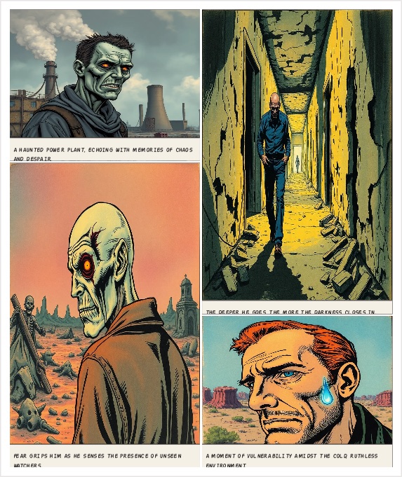 a scarred burned glowing ghoul like man walks through a derelict power plant trying to escape it,...