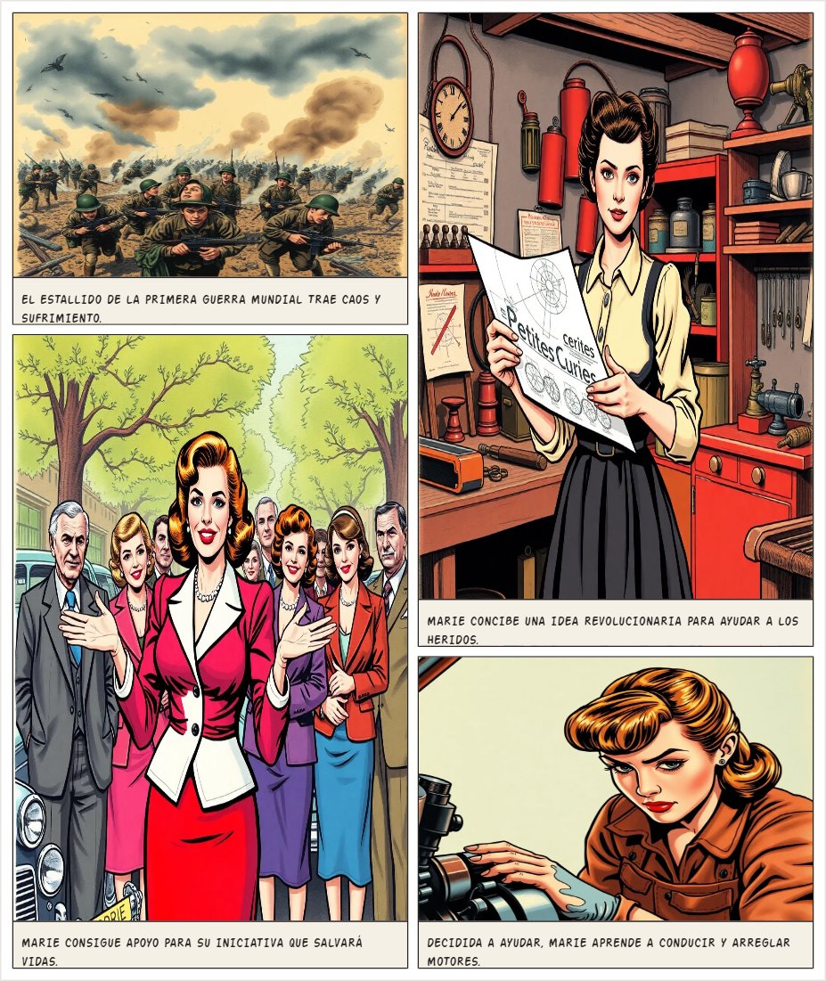 Página 11: La Gran Guerra (1914) Viñeta 1: Estalla la Primera Guerra Mundial. Los soldados mueren en el frente por falta de diagnósticos. Viñeta 2: Marie decide ayudar. Diseña las "Petites Curies" (Pequeñas Curies): camiones con rayos X. Viñeta 3: Convence a gente rica de donar sus autos para convertirlos en ambulancias. Viñeta 4: Marie aprende a conducir y nociones básicas de mecánica. Viñeta 5: Vemos a Marie en el frente de batalla, bajo el sonido de las bombas. Viñeta 6: Los médicos mili