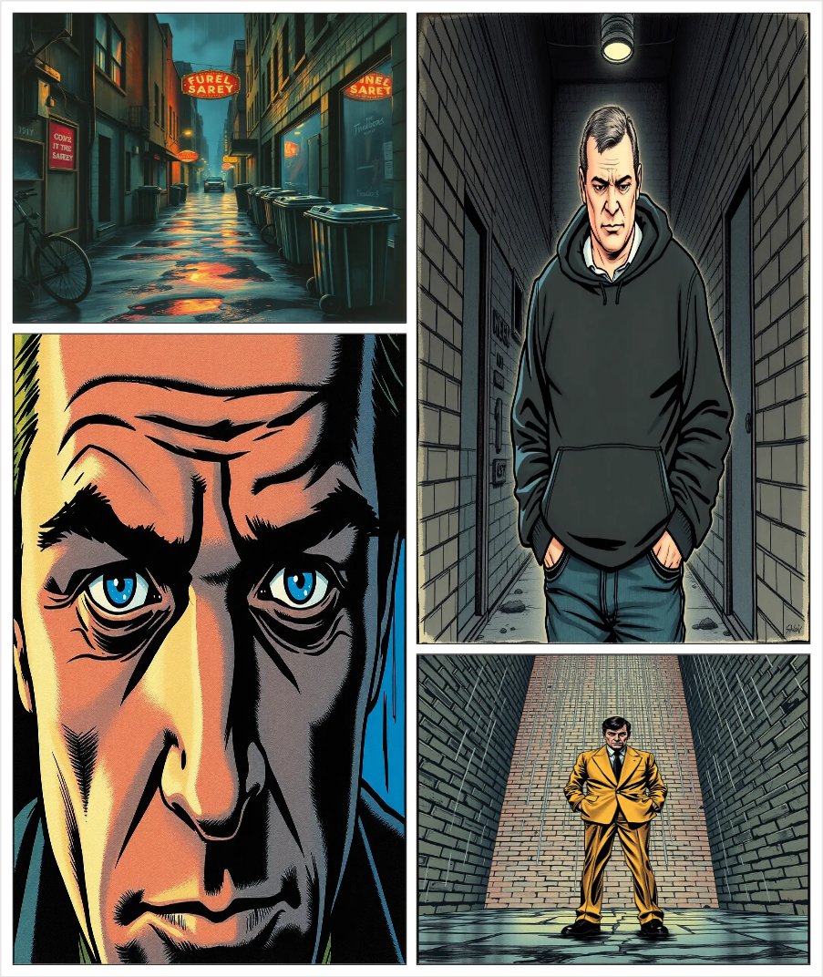 Highly detailed realistic comic-style full body character, based on the uploaded face reference, preserving strong facial likeness, bone structure, proportions, age, skin texture, and expression from the original photo. Character portrayed in a posture inspired by David Berkowitz: heavy-set stance, slightly hunched posture, shoulders forward, head subtly tilted downward, hands loosely positioned near pockets, conveying inward tension and emotional withdrawal. Calm but brooding presence, vacant