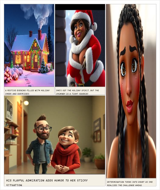 a plump, plus sized black woman with a very full and curvy figure. Red lips, and long braids. Dressed in sexy santa costume tries to squeeze down the chimney and gets stuck! Her body too fat to fit! Her boyfriend, a bald and bearded hipster, sees her bottom half sticking out of the chimney and loves it!