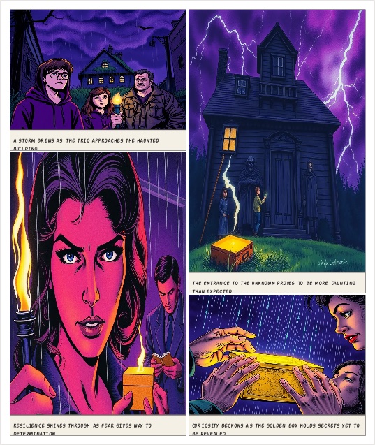 In a dark street of luna. Harry, Marritsa(girl) and hamilton goes in search of a missing dog with a torch in hand to a haunted building outside full of grass and thunderstorm in the sky, the climate is dark in colour, theme should have a dark purple theme with harry wearing specs. They try to go inside the building but cant open the door. But outside they find a mysterious golden box