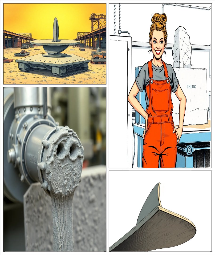 make machine in a box, with many nozzles. the nozzles are printing a concrete structure that looks like two discs placed perpendicular to each other. the discs are rounded, with a pointier horizontal disc sticking out, where the under side it thicker than the top side. structure has no foot, it is floating