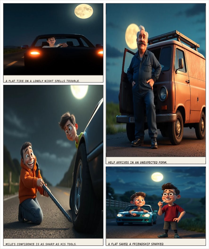 Panel 1: Night highway. Car stopped, flat tire. Driver panics. Driver: “This always happens to me!” Panel 2: Old service van skids in. Mile steps out, mustache proud. Mile: “Relax. Tires fear me.” Panel 3: Mile pulls a giant nail from the tire. Mile: “Free renovation bonus.” Panel 4: Car drives off happy. Mile lights a cigarette. Driver: “You saved my life!” Mile: “I saved your tire.”