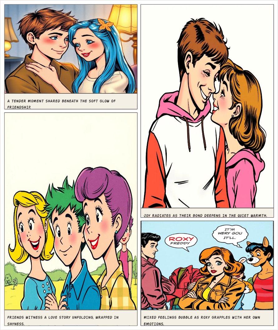 Comic Outline: Freddy & Bonnie Romance + Friends Page 1 – Freddy & Bonnie Cuddling (Pages 16–17 of story) Panel 1: Close-up of Freddy holding Bonnie, forehead to forehead, eyes closed, soft blushes. Dialogue: Freddy: “Forever… just us, Bonnie…” Panel 2: Bonnie giggles, pressing nose against Freddy’s shoulder. Dialogue: Bonnie: “I love this… being with you…” Panel 3: Chica, Monty, Roxy in the background, watching shyly. Dialogue: Chica: “They’re so cute…” Monty: “Every glance… perfect…” Roxy: