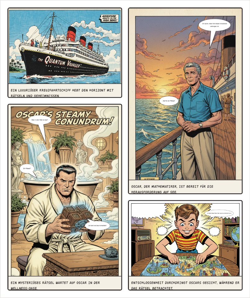 Ich möchte für meinen Onkel Oscar (70 Jahre alt, gross, dünn, graue kurze Haare). Die Idee ist, dass Oscar ein Theoretiker, Mathematiker und Physiker ist, dessen Superkraft auch in diesem Bereich liegt. Dabei soll er Rätsel in einem Wellness und auf einem Schiff lösen. Plot der Geschichte am Schluss soll sein, dass Oscar in einem Comicladen steht und die Geschichte von selbst liest.