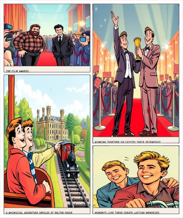 2 friends. Ryan, a 40 something year old with brown hair and beard, stocky build, black jeans and flannel shirt and John James, a late teen, fat, short black hair. The story is their shared life experience. From the Film Awards walking the red carpet and accepting the award for best animation to visiting Belton House and riding the miniature railway to days out with Bridge