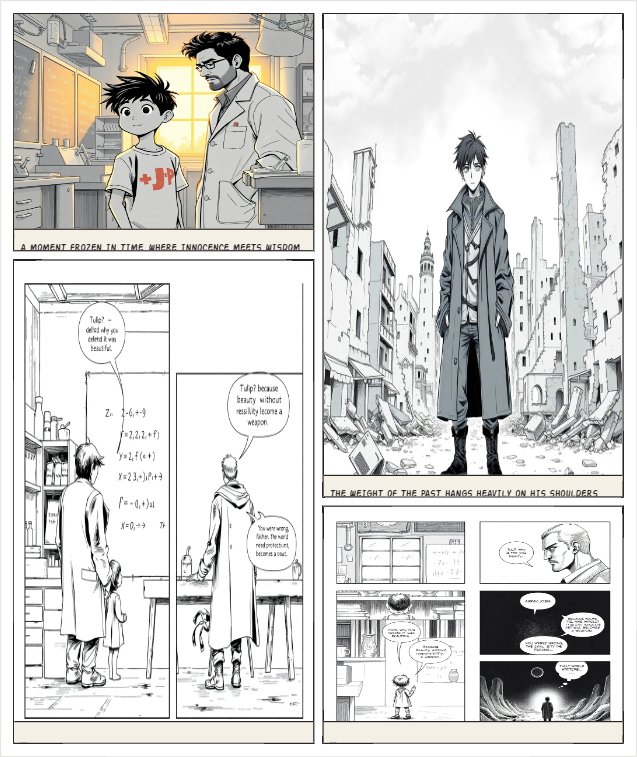 TWO WORLDS COLLIDE Arc 1: The Inheritance of Ruin CHAPTER 2: FATHER AND SON Panel 1 — Flashback (15 Years Ago) (A warm lab. Young Tulip watches his father erase equations.) Tulip (child): “Papa… why did you delete it? It was beautiful.” Dr. Aarav Joshi: “Because beauty without responsibility becomes a weapon.” Panel 2 — Present (Past Timeline, 50 Years Back) (Adult Tulip in the empty world remembers.) Tulip (thinking): You were wrong, father. The world didn’t need protection. It needed evolut