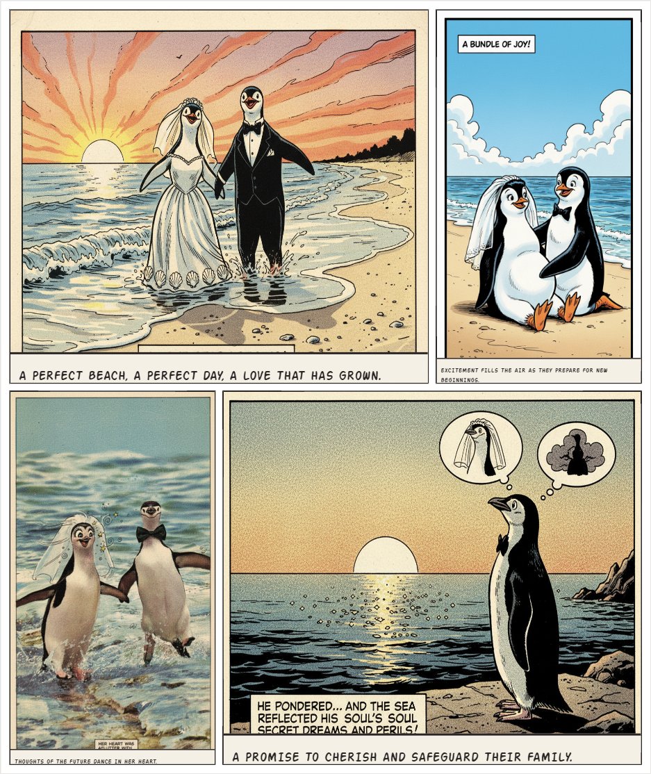 two penguins fall in love and get married on the beach dressed in wedding attire. ten years pass and now the girl penguin is pregnant. there are no humans in the comic.