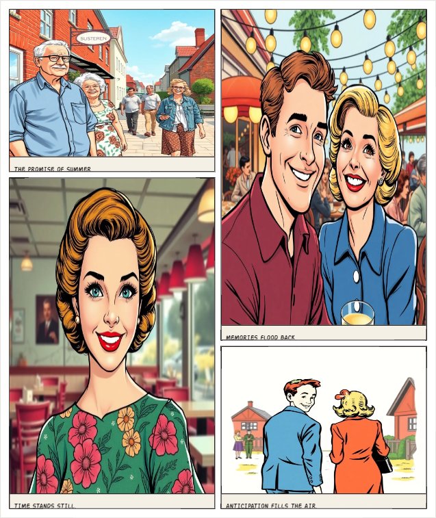 { "title": "A Summerhouse Reunion", "panels": [ { "panel": 1, "scene": "Sunny day in Sønderborg. An elderly man, Jørgen (male, 78, white), wearing a blue linen shirt, stands outside a red-brick restaurant. Karen (female, 79, white), in a floral dress, smiles beside him. Anders (male, 50, white) in a polo shirt and Anne Sofie (female, 40, white) in jeans jacket walks toward them.", "speech": "Finally here! The traffic was insane.", "caption": "The promise of summer