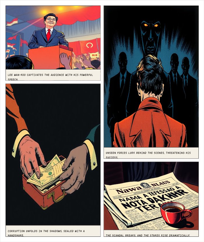 Panel 1: Lee Wan-koo berdiri megah di pentas politik, disorot cahaya, orang ramai bertepuk tangan Panel 2: Bayang-bayang gelap di belakang beliau (simbol rahsia & rasuah) Panel 3: Wang dan dokumen diserahkan secara sulit Panel 4: Tajuk akhbar besar: “Nama Dalam Nota Terakhir”
