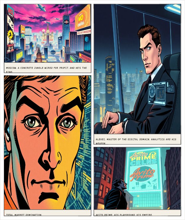 A cyberpunk comic about a 39-year-old Avito marketing mastermind in futuristic Moscow. He is a di...