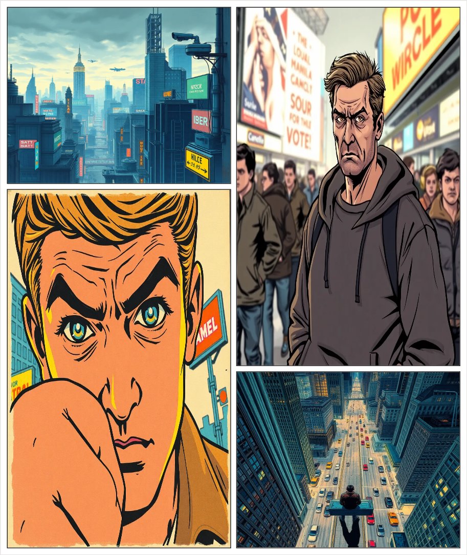 Planche 1 — Monde moderne Ville froide, écrans, caméras, slogans vides Samuel en colère contenue Voix off : « Ils appellent progrès ce qui efface l’homme. »