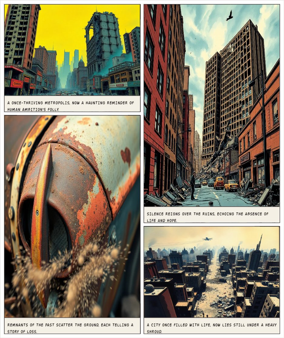 Wide panoramic comic panel of a destroyed futuristic city, post-apocalyptic setting. Crumbled sky...
