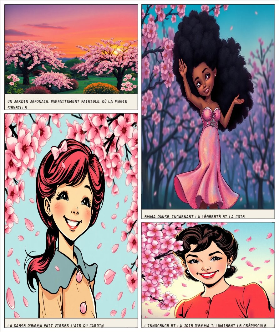 Emma, jeune héroïne afro-descendante, cheveux afro volumineux, sourire expressif, posture dansante gracieuse, tenue de sirène scintillante multicolore. style bande dessinée réaliste, illustration BD haut de gamme, contours noirs nets, couleurs vives et lumineuses, rendu détaillé, éclairage cinématographique, profondeur de champ, mouvement fluide, composition claire, format case de BD, sans texte dans l’image. Emma danse dans un jardin japonais au crépuscule, cerisiers en fleurs