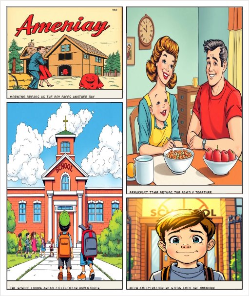 Mini fumetto: A Day in My Life (8 vignette) 🖼️ Vignetta 1 – Wake up Prompt: A cartoon-style comic panel of a young boy waking up in his bedroom in the morning, the sun coming through the window, alarm clock showing 7:00 am, bright colours, simple style, for children 🖼️ Vignetta 2 – Breakfast Prompt: A cartoon-style comic panel of the same boy having breakfast with his family at the table, milk and cereal on the table, happy morning scene, bright colours, simple style 🖼️ Vignetta 3 – Sch