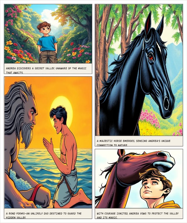 Titolo della storia: “Andrea e Poseidone – I Custodi della Valle Nascosta” I protagonisti: Andrea: Ha 11 anni, è curioso, gentile e osserva il mondo con attenzione. Non ama la violenza.Riesce a sentire le emozioni degli animali, anche quando gli altri non se ne accorgono. Poseidone: Un magnifico cavallo murgese dal manto nero lucido e dagli occhi profondi. Inventami una storia con superpoteri