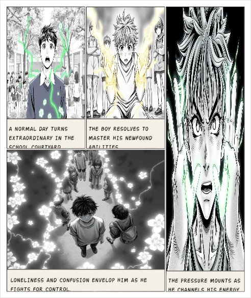 Panel Prompt Example: A teenage Korean boy stands in a school courtyard as green glowing vines burst from the ground around his feet, flowers blooming in seconds, his hands glowing with magical energy, shocked expression on his face, anime manhwa style, cinematic lighting, detailed comic panel.