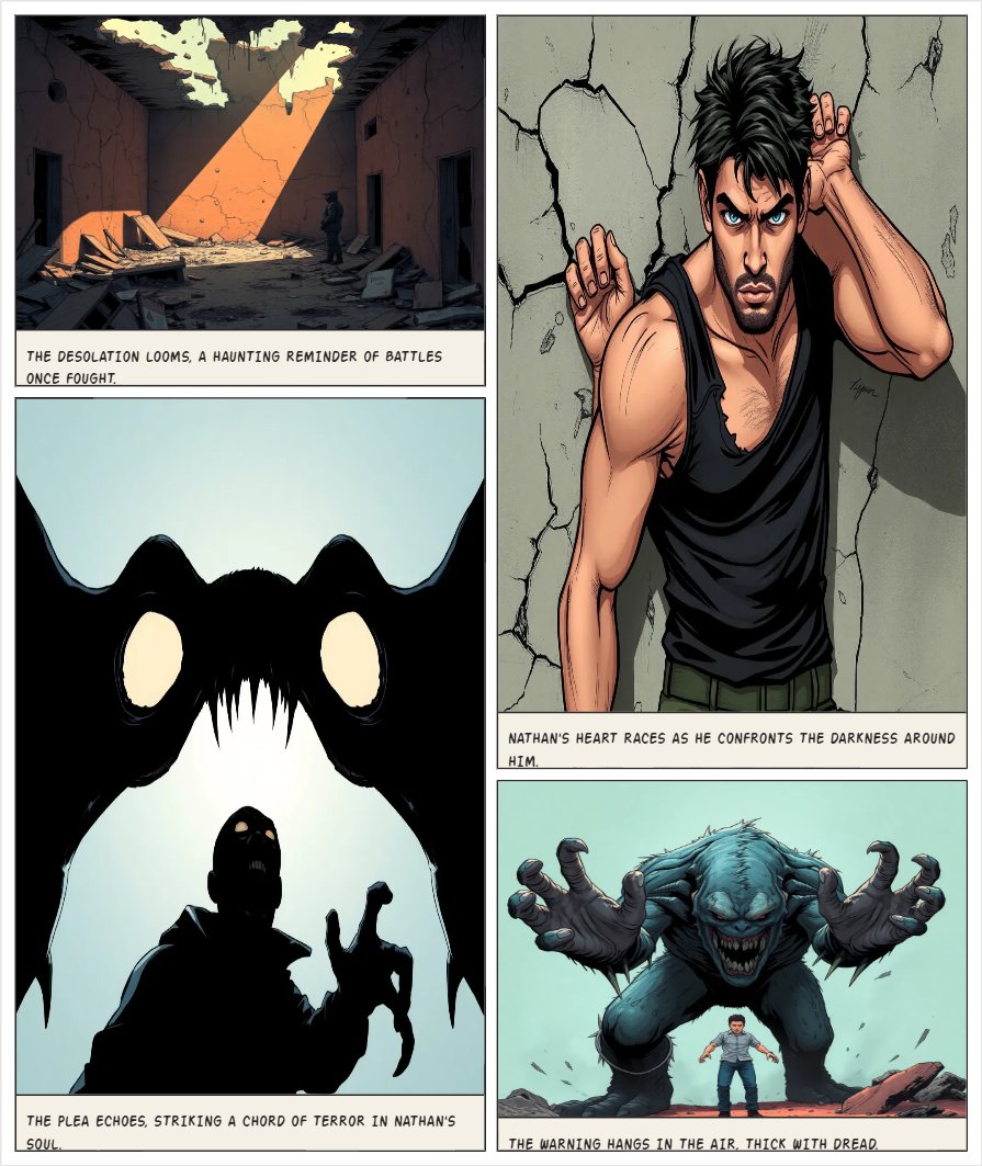The ruined training room stretched out around him, shadows clawing at every corner. Nathan’s back pressed hard against the cold, cracked wall, heart hammering in his chest. Before him, a silhouette twisted into a grotesque, half-human shape, stumbling forward with outstretched hands. Its voice was a ragged whisper, barely human. “Please… help me…” it begged, voice trembling, desperate. “Run… run, Nathan…” The words warped, twisting like smoke around his mind. “Run… run… run…” Then the creature’s