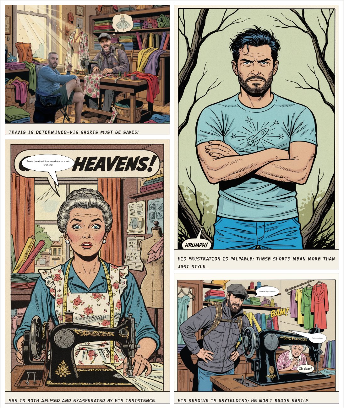Travis insists the seamstress fix his shorts. he will not leave until she fixes them.