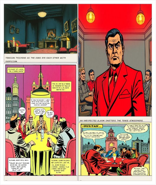 PANEL 1 (Scene: Ek purani building "The Citadel" ke top floor par andhera kamra. Baahar bijli kadak rahi hai. Table par 7 Mafia Dons baithe hain.) SULTAN: (Thandi awaaz mein) "Is table par baithe 7 logon mein se ek ki niyat mein khot hai. Kaun hai wo gaddar?" KABIR: (Gusse mein chillate hue) "Jo bhi hai, uska sir meri talwar par hoga!" PANEL 2 (Scene: Achanak building mein ek alarm bajta hai. Red lights jalne lagti hain. Vikram Singhania khada ho jata hai.) VIKRAM: "Der ho gayi Sultan! Ye imarat