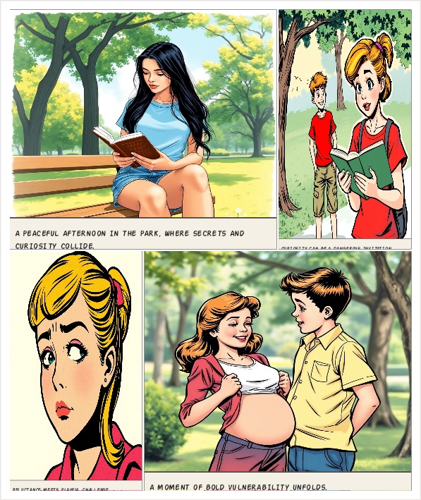 Make her minding her own business until someone else asked her to show them her belly because they were curious to see her belly under her shirt so she reluctantly agrees and was like * sighing dramatically*what ever 😒 and does it that , make this into a comic book panel by panel scene including that dialogue and the moment she’s asked and the moment she that she does it make this into full scene panel by panel including the dialogue, and making it into a comic book style