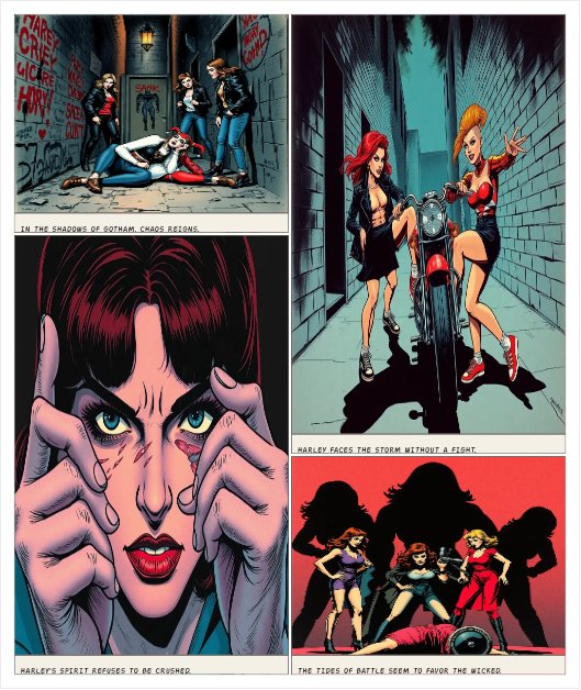 En un callejon oscuro de Gotham . Harley Quinn se haya tirada en posición fetal en el suelo, tapandose la cabeza con las manos y rodeada por cuatro mujeres pandilleras rivales que le están propinando una brutal paliza a base de patadas por todo el cuerpo. Harley no se defiende, se limita a soportar la paliza como puede. Las cuatro agresoras la patean a la vez. Las pandilleras visten con chaquetas de cuero negras , pantalones vaqueros largos azules, zapatos y blancos adidas. Harley viste con su l