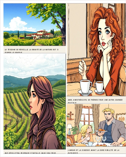 Jade une anesthésiste de renommée mondiale se lève dans sa maison en toscane. Elle prend son café devant les vignobles italien avant de partir au bloc opératoire sauver des vies. Le soir elle dîne au restaurant italien avec son mari Elle est brune les cheveux bouclés mi long, très mince, les yeux marrons et son epoux blond aux yeux bleus