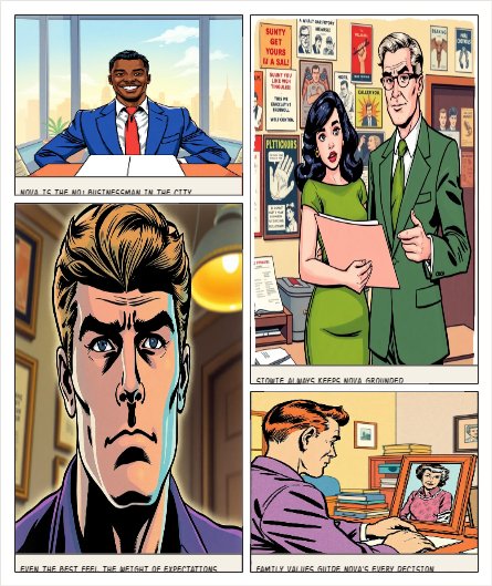 COMIC TITLE: NOVA – THE FALL & THE COMEBACK Type: Comic Age Group: 9–13 Language Style: Funny + Serious CHARACTERS Nova – Hero, No.1 businessman, kind & polite Siowie – Nova’s wife, smart & supportive Sam – Siowie’s best friend (secretly bad) Ruban – Villain, cruel scam businessman Nova’s Mother – Loving and caring PAGE 1 – THE HERO Panel 1: (Nova in a big office, smiling) Narrator: Nova is the No.1 businessman in the city. Nova: “Success is good… but kindness is better!” Panel 2: (Nova