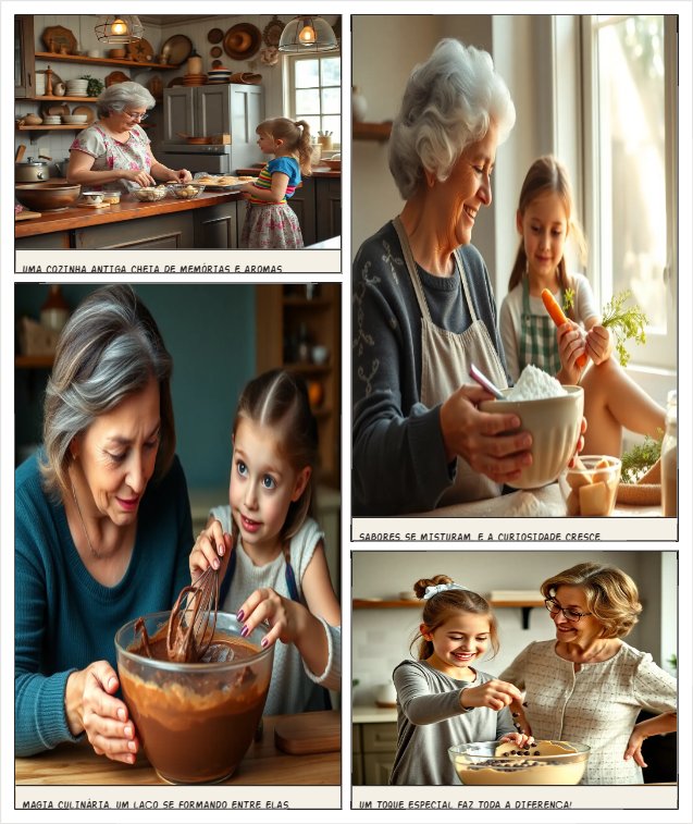 Uma avó trabalhando na cozinha, com decoração antiga, ,fazendo com a neta um bolo de chocolate com cenoura.