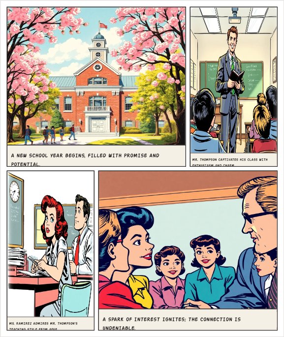 Create a romantic slice-of-life comic about two teachers who meet at work and fall in love. Male...