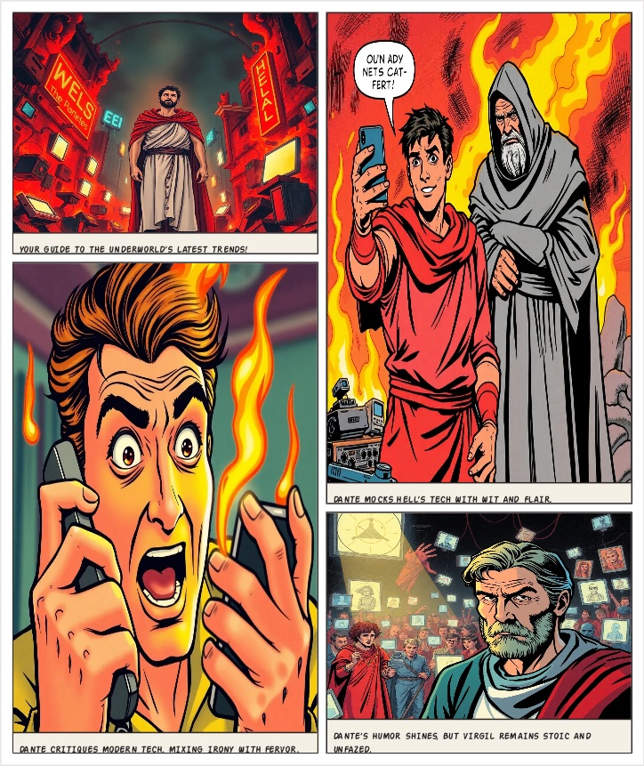 Generate a satirical vlog titled “DANTE.AI VLOG #1 – I WENT TO HELL (NOT CLICKBAIT)”. Handheld influencer POV, jump cuts, ironic captions; medieval Hell meets modern tech. Dante Alighieri hosts: witty, self-aware, quotes Italian lines while roasting bad Wi-Fi, algorithms, monetization. Virgil is the stoic guide, deadpan.