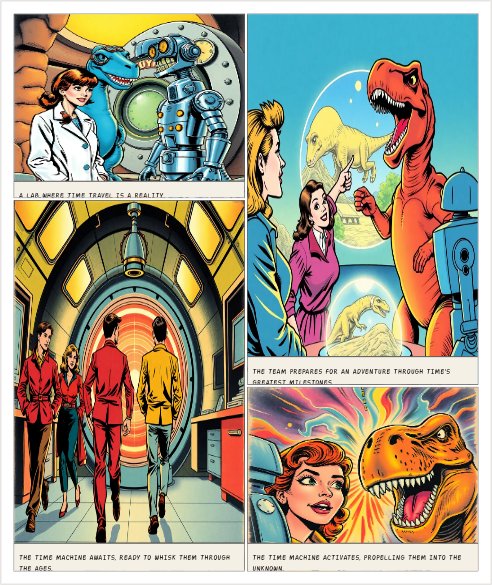 Page 1 (Introduction to Time Travel) grid1: A futuristic lab or time machine, introducing the time travelers (perhaps a mix of humans and talking creatures from different time periods). Grid 2: The team talks about their mission: traveling through Earth's history to witness key scientific events (like mass extinctions or the rise of different species). grid 3: They step into the time machine, preparing to launch. grid 4: The machine activates, and the background changes to represent time