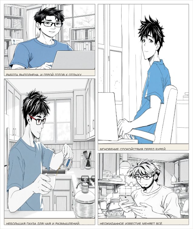 Сгенерировать комикс состоящий из 10 изображений с 1 персонажем. Сверху название комикса: «Будни тревожного фрилансера» 1. Ноутбук. На экране — переписка в мессенджере: Работодатель: «Жду отчёт к 15:00» Герой: «Здравствуйте, Анна Сергеевна! Отчёт готов 👍» (прикреплён файл: «отчёт_финал_исправленный_2.xlsx») Герой нажимает «Отправить». 2. За окном светло. Герой откидывается на стуле, выдыхает: «Ну, наконец-то… Можно и отдохнуть». 3. На кухне наливает чай. Улыбается. 4. Внезапно — стоп