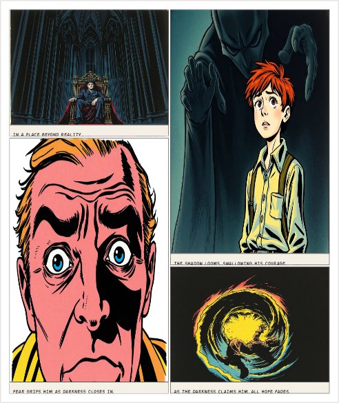 Panel 1 (Full-width, dramatic): A vast dark throne hall. A man with long hair and glowing pink eyes sits on a throne. His shadow stretches unnaturally. Narration: In a place beyond reality… Panel 2: A school boy (VOID) stands before the throne, trembling. The shadow completely covers him. Panel 3 (Close-up): Void’s eyes widen… then roll back. SFX: THUD Panel 4: Void collapses into darkness.