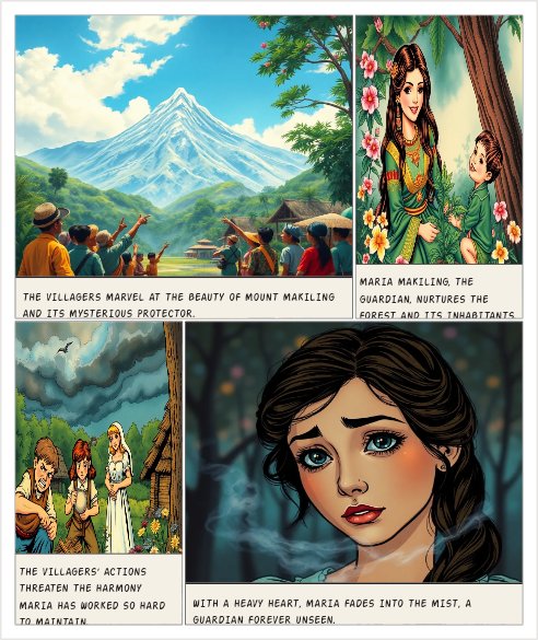 Create a one-page, 4-panel comic titled “The Guardian of Mount Makiling,” based on the Philippine legend of Maria Makiling. Show Mount Makiling lush and peaceful as villagers speak of a mysterious guardian. Introduce Maria Makiling, a kind diwata in traditional Filipino clothing, helping people and protecting nature. Depict villagers abusing the forest, causing Maria Makiling to withdraw in sadness. End with her fading into the mist, symbolizing her eternal role as the mountain’s guardian.