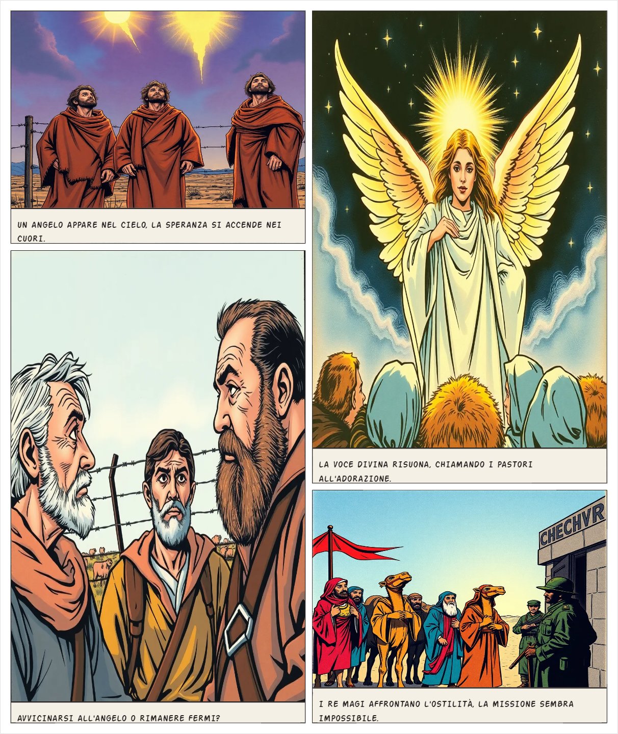 all'esterno del filo spinato, davanti alla capanna, ci sono tre pastori con sguardo rivolto in alto, dove è apparso un angelo che dice in italiano "venite ad adorare il bambino" e loro rispondono: "non possiamo superare i check point... arriveremmo per Pasqua". Sulla destra un po piu lontani ci sono i re magi ad un check point con soldati che sequestrano i loro cammelli e i doni