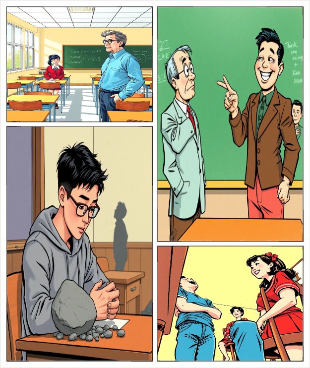 四格漫畫構思 主題:超能力學生的日常 角色: 小明:擁有瞬間移動能力,性格活潑。 小紅:能夠操控時間,性格冷靜。 小華:擁有超強力量,但性格害羞。 劇情大綱: 第一格:小明在課堂上,突然瞬間移動到黑板前,做了一道題目。 小紅在旁邊捂嘴笑。 第二格:老師驚訝地問:“小明,你怎麼會在那裡?” 小明得意地說:“我有特異功能!” 第三格:小華在角落裡小聲說:“我也有功能,但我只想安靜地學習。” 餘光中,看到小華手握著一顆大石頭。 第四格:小紅微笑調侃:“你要是能控制好力量,也許老師會給你加分哦!” 小華臉紅,小明則笑得扭了起來。