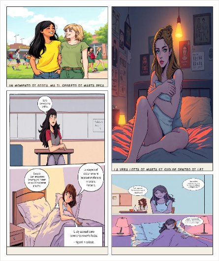 TAVOLA 1 โ€“ IL PESO DEL SEGRETO Inquadratura: Due pannelli sovrapposti. Pannello superiore: Scuola, intervallo. Marta ride con Sara. Sara (dialogo): "Sei sempre bravissima in tutto!" Pannello inferiore: Camera di Marta, sera. Seduta sul letto, abbraccia un cuscino. Pensiero (Marta): "Se solo sapesse come mi sento davvero... Mi sento sempre in colpa." Colori: Contrasto tra toni caldi (scuola) e freddi (camera). BOX EDUCATIVO 1 ๐ŸŸจ Lo sapevi? I disturbi del comportamento alimentare riguarda emozion