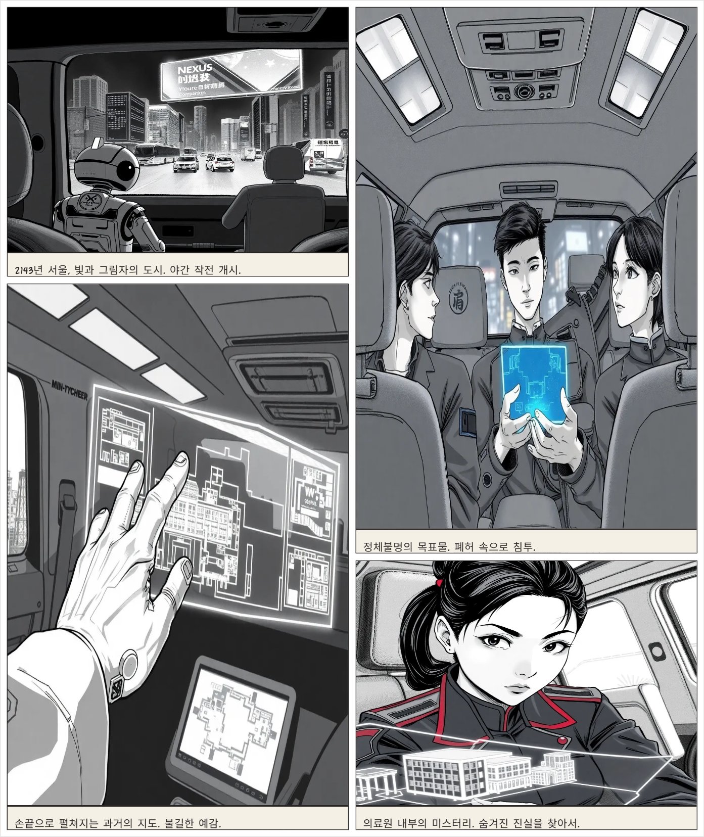 장소: 대응반 수송 차량 내부, 야간 분위기: 일상적인 작전 분위기 자율주행 차량이 어두운 도로를 달린다. 창밖. 2143년 서울. 자율주행 차량들이 규칙적으로 흐른다. 보행로봇 한 대가 횡단보도를 건넌다. 목에 새겨진 K-커넥톰 인증 마크. 홀로그램 광고판이 밤하늘을 밝힌다: "넥서스 커넥톰 - 당신의 완벽한 동반자" 차량 내부. 좌석에 앉은 네 명의 대응반 요원. 민철 (40대, 팀장. 차분하고 믿음직한 인상) 홀로그램을 손가락으로 넘기며 "목표 지점은 舊 서울중앙의료원. 2089년 폐쇄 이후 방치." 홀로그램에 건물 도면이 뜬다.