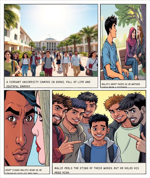 Can you help me create a comic story using the attached images about the origin of an Arab superhero from Dubai during his university years named Malik? At the beginning of his university life, he was shy and introverted, and he had a crush on a classmate named Sarah, but he didn't dare to confess his feelings to her. He was kind-hearted, pure, and always willingly helped others. His body was of average build, but there were classmates who bullied him because he was preoccupied with computers an