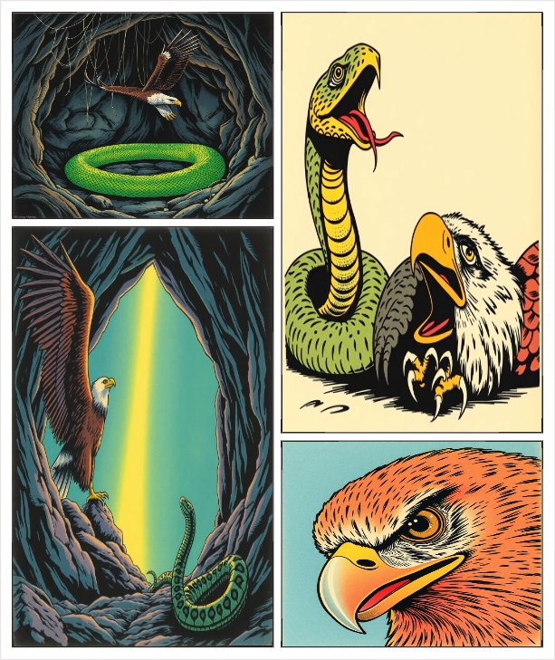 पहला फ्रेम: अँधेरी गुफा में साँप बैठा है। घायल बाज गिरता है। साँप: “यह क्या गिरा?” दूसरा फ्रेम: ...
