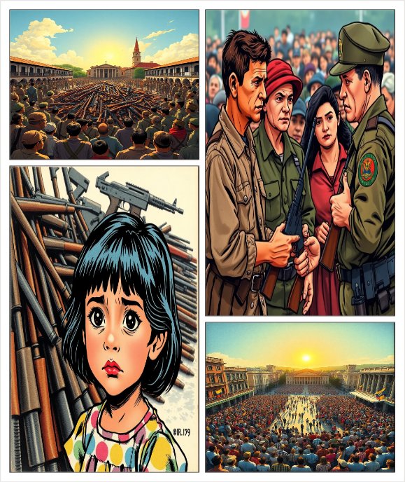 Titre de la BD : "Colombie : De la Paix aux Défis Économiques" La Fin de la Guerre (2016) "Novembre 2016, Colombie. Après 52 ans de conflit armé, le gouvernement et les FARC signent un accord de paix historique. Mais la paix ne se décrète pas : elle se construit. " "Une scène réaliste et symbolique : une place publique en Colombie, avec des anciens combattants des FARC rendant leurs armes sous le regard d’une foule mélangée (paysans, soldats, enfants).