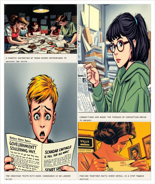 A scrapbook-style comic cover showing torn newspaper headlines about corruption, faded photos of ...