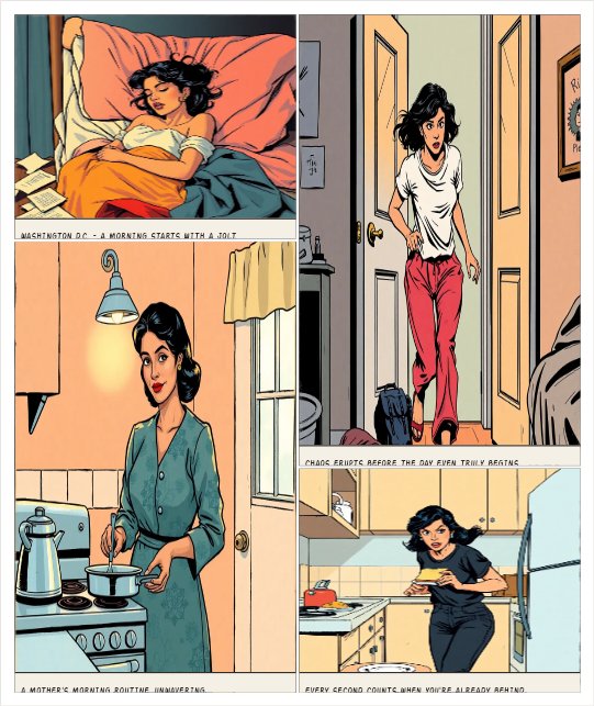 EPISODE 1 – BROKEN MORNING Morning sunlight barely slips through the thin curtains of a small apartment in Washington, D.C. An alarm rings—sharp, impatient. Riya Watson jolts awake, her eyes widening as she checks the time. Late. Again. The first panel shows chaos. Riya jumps out of bed, nearly tripping over her bag. Her hair is messy, her expression determined but tired. She rushes into the tiny kitchen where Monica Watson, her mother, stands near the stov