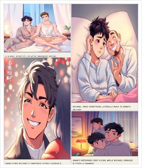 Micheal is a soft, cuddly and loveable guy who takes everything literally. Danny is his lithe coworker who always speaks in metaphors and innuendos. The two of them are in the middle of a wild night in bed. Danny can't help but find Michael's literal responses to his innuendos adorable.