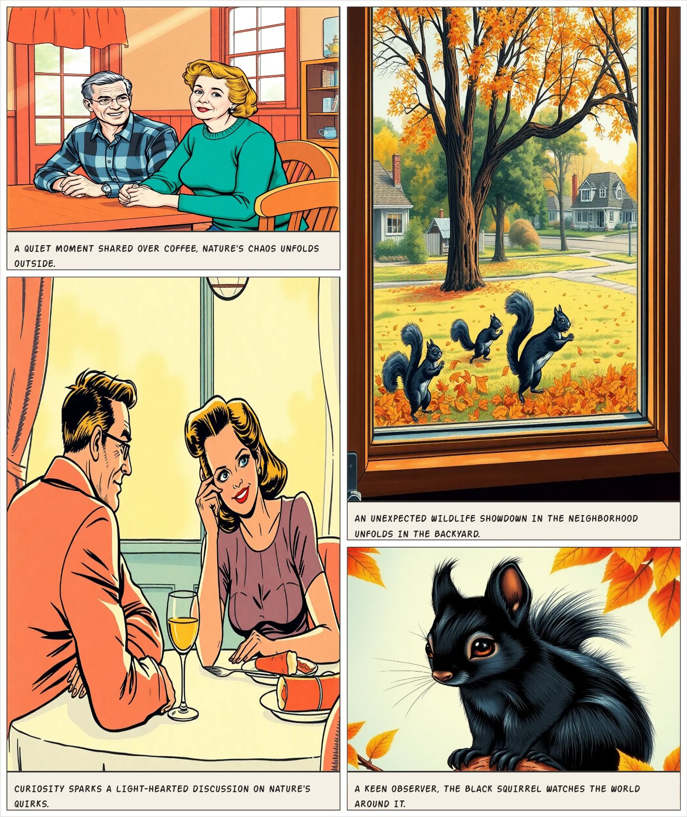 Panel 1: A minimalist sketch of a man sitting on a chair at a table next to a window. His wife is sitting across from him. He says "Looks like the black squirrels are really starting to outnumber the gray ones." panel 2: A view our a window into a yard near a road. Black and gray squirrels are frolicking in the leaves. panel 3: Back to an indoor scene with the man and wife sitting at the table. The wife says “I hear the black ones have better eyesight.” panel 4: Closeup of a black squi